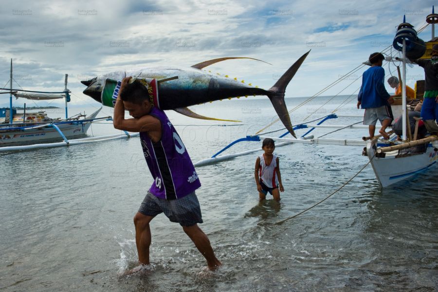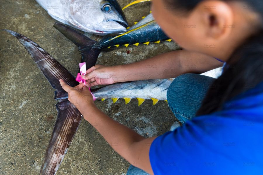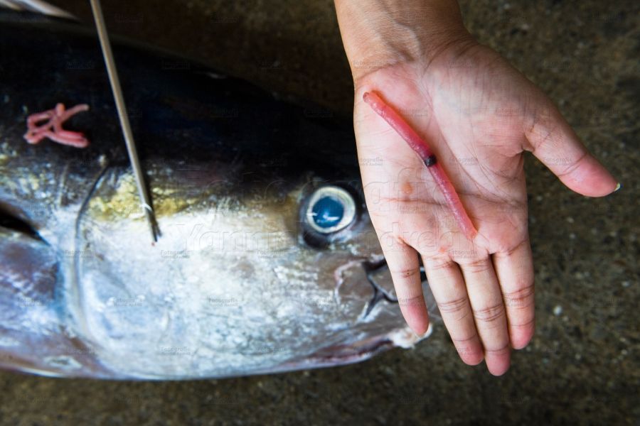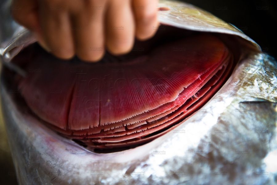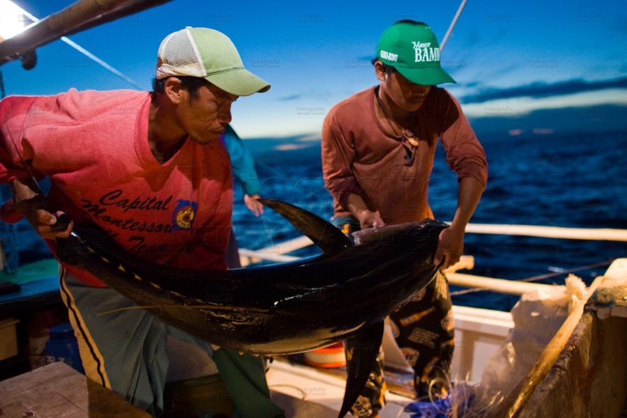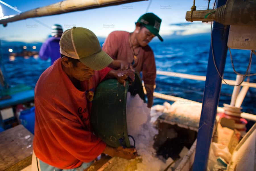 Der Thunfisch wird im Wasser mit einem Schlag auf den Kopf betäubt und an Bord gehievt. Mit einem Messer wird das Rückgrat am Kopf durchtrennt. Zwei Männer legen eilig den Fisch in eine Box und schütten ihn mit Eiswürfeln zu, was eine bessere Qualität des Fisch-Fleischs verspricht.
