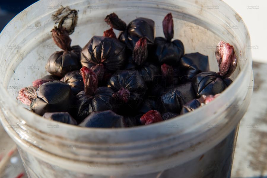 Fast faustgrosse Steine werden mit einem Beutel Tintenfisch Tinte versehen und mit dünnerem Silch umwickelt und zur Seite gelegt, quasi als „Vorfach“ wie ein Bündner Fischer sagen würde.