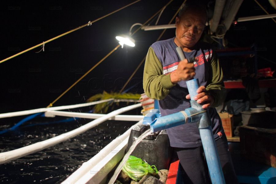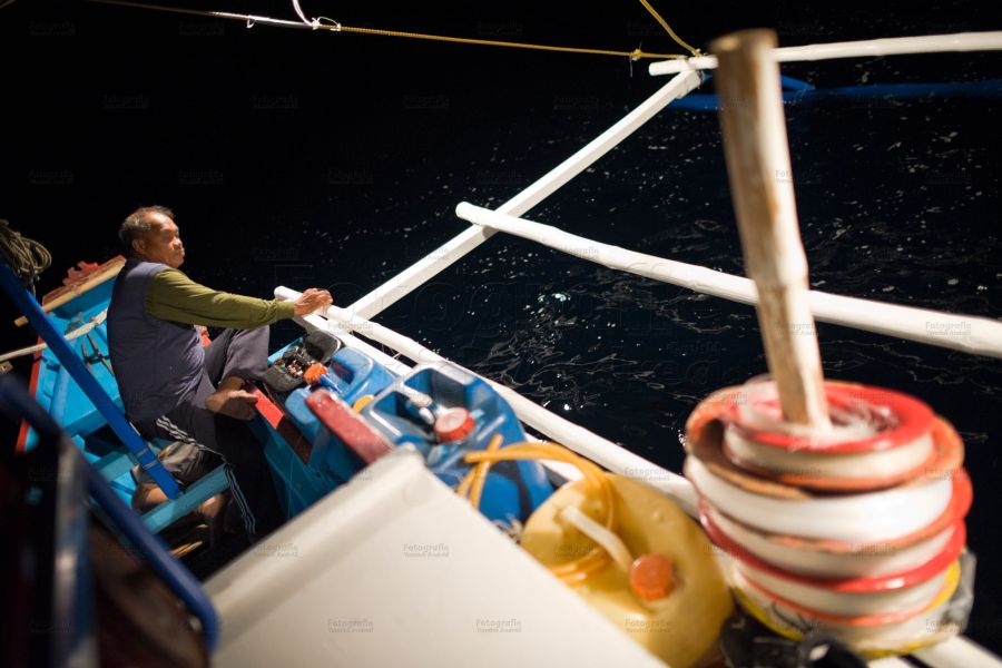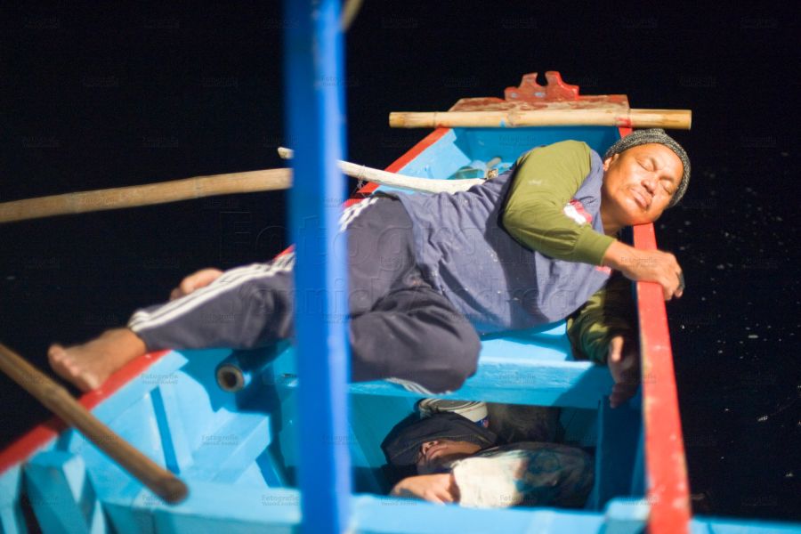 Die Fische beissen erst in den Morgenstunden. Wir haben also Zeit, Zeit um etwas zu schlafen. Vorher wird mit einer Plastikpumpe noch das angesammelte Wasser im Schiffsrumpf abgepumpt. Einer macht es sich alsdann auf der Bordkante bequem, andere im Schiffsrumpf unter Fischereimaterial versteckt.