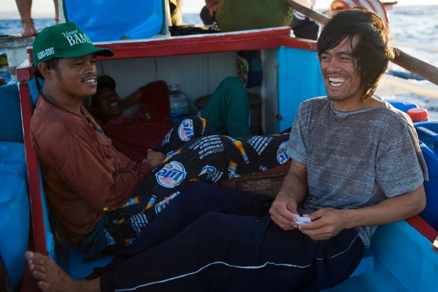 Mit einem breiten Lachen fährt die ganze Crew im morgendlichen Sonnenschein dem Festland zu. Das Anlanden des Fisches im hafen übernehmen andere. Das halbe Dorf ist auf den Füssen und schaut dem emsigen Treiben der einlaufenden Fischereischiffe zu.
