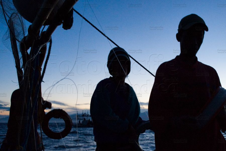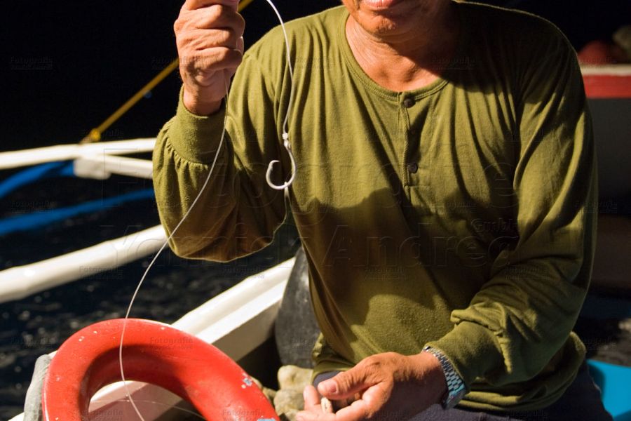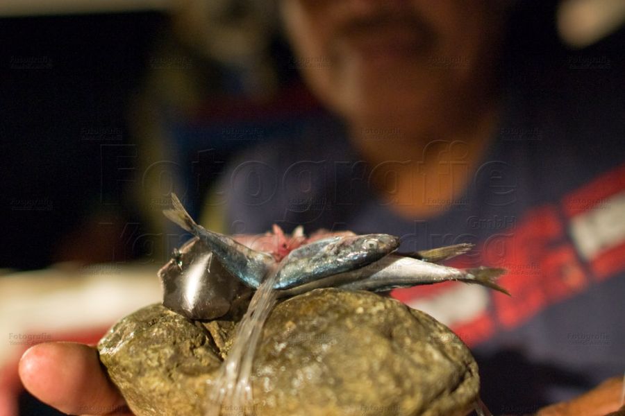 Keiner der Fischer lässt sich beeindrucken und beginnen nun mit ihrer Arbeit: Die Silche werden ausgeworfen. Mit einem geübten Ruck wird das Vorfach von dem Stein getrennt, dabei wird der Beutel mit Tintenfisch Tinte aufgerissen und ist nun als Köder bereit.