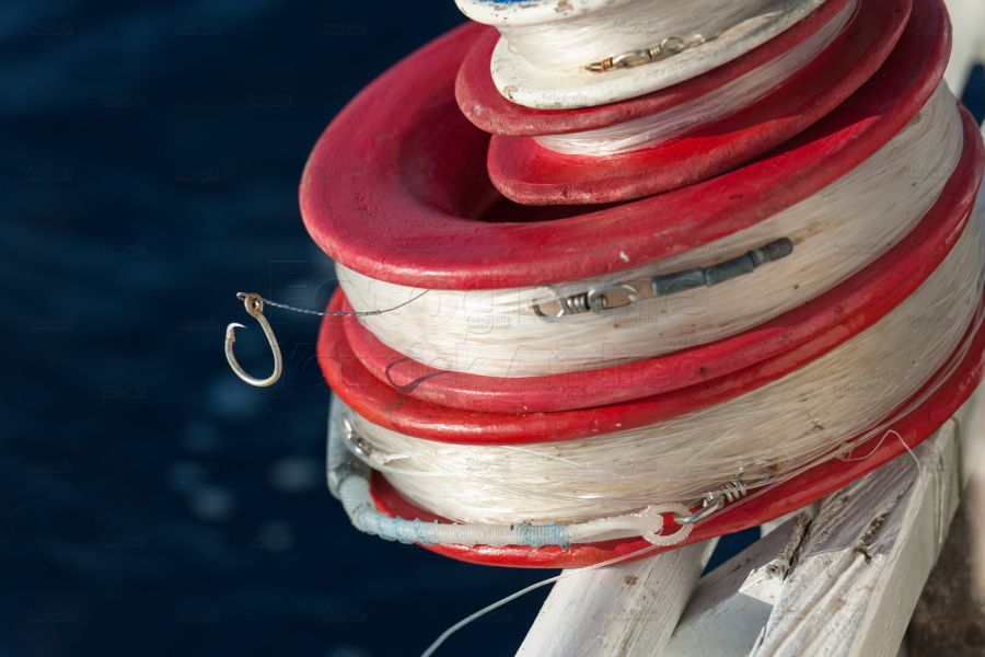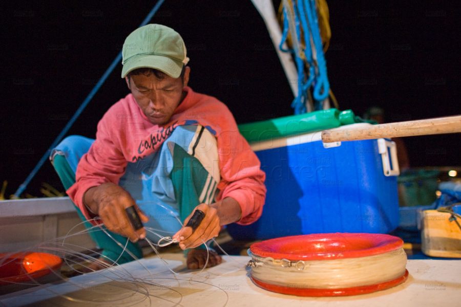 Noch herrscht Betriebsamkeit an Bord. Die Silche zum Angeln in 200 Meter tiefe, drahtig und dick, werden mit grossen Angelhaken versehen.