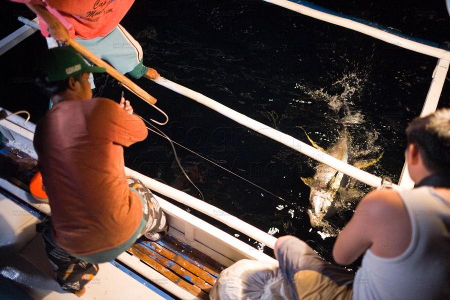 Nach einer Weile sehen wir im Schein der Laterne, wie ein Thunfisch an der Angel seine Kreise mit hoher Geschwindigkeit gezwungenermaßen immer enger unter dem Schiff zieht, bzw. immer enger ziehen muss, da der Silch immer kürzer wird.