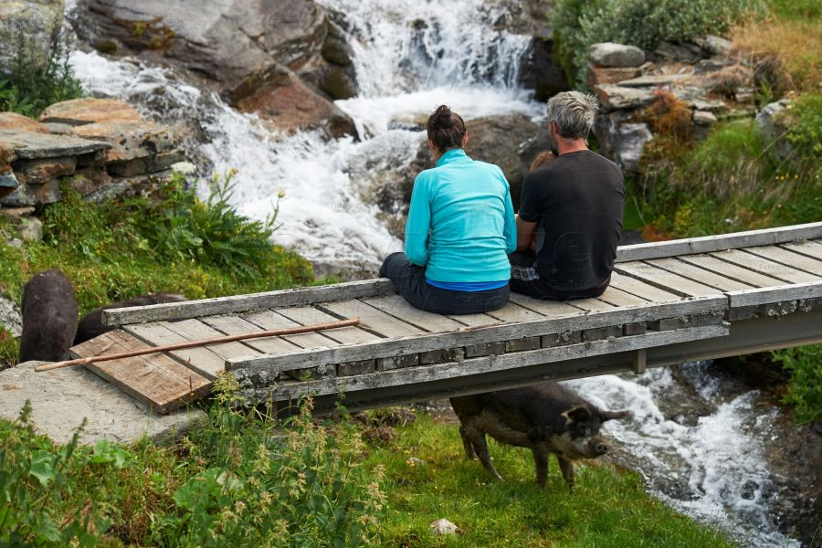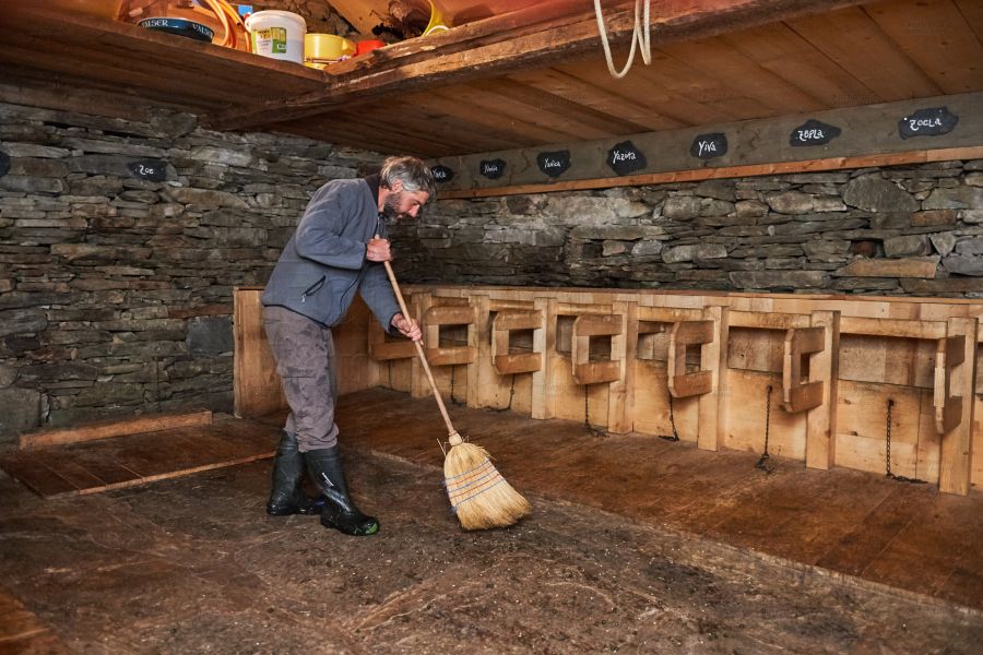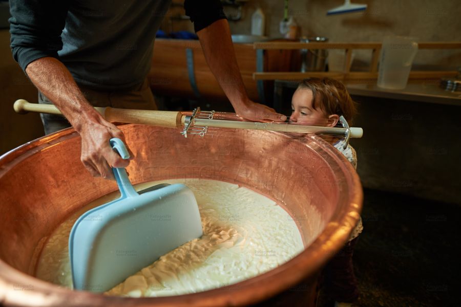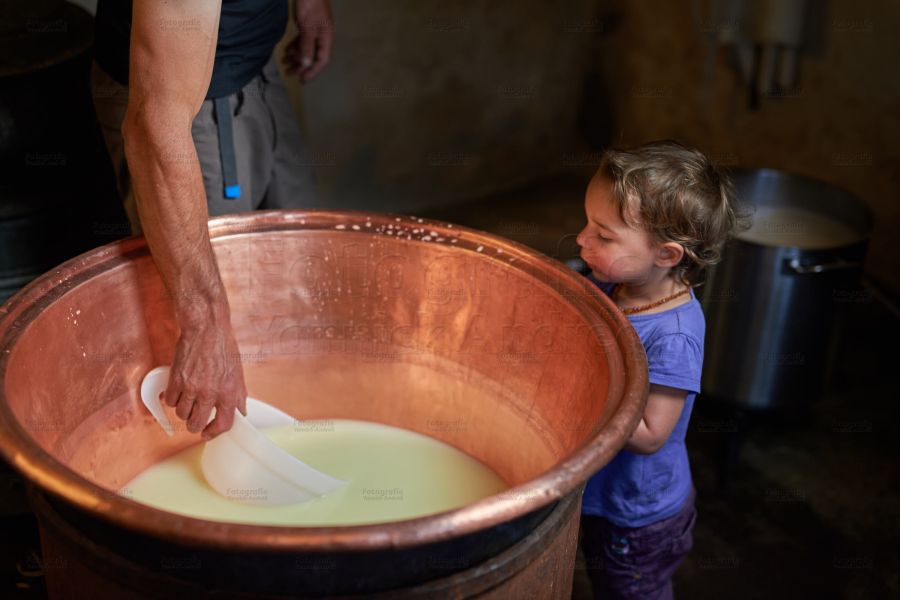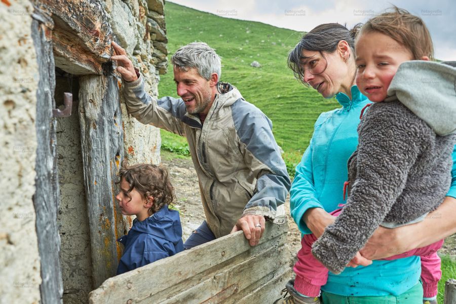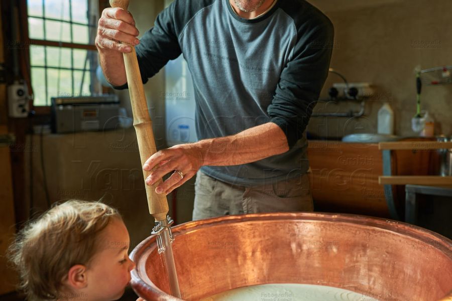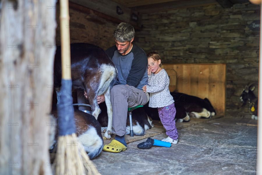 Bei so vielen Tätigkeiten kann es ja nie langweilig werden: So kontrolliert die eine Tochter die Ziegen vor dem Weidegang, die andere, ob der Papa die Käse richtig schmiert. Beide stehen am Käsekessi, füllen den Käsebruch in Käseformen, spritzen den Presstisch ab, jagen Hühner hinterher, oder treiben die Wollschweine zur Abkühlung in den nahegelegenen kühlen wilden Bergbach. Ach ja, das Bilderbuch wartet ja auch noch in der guten Stube.
