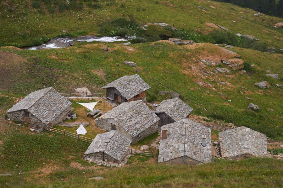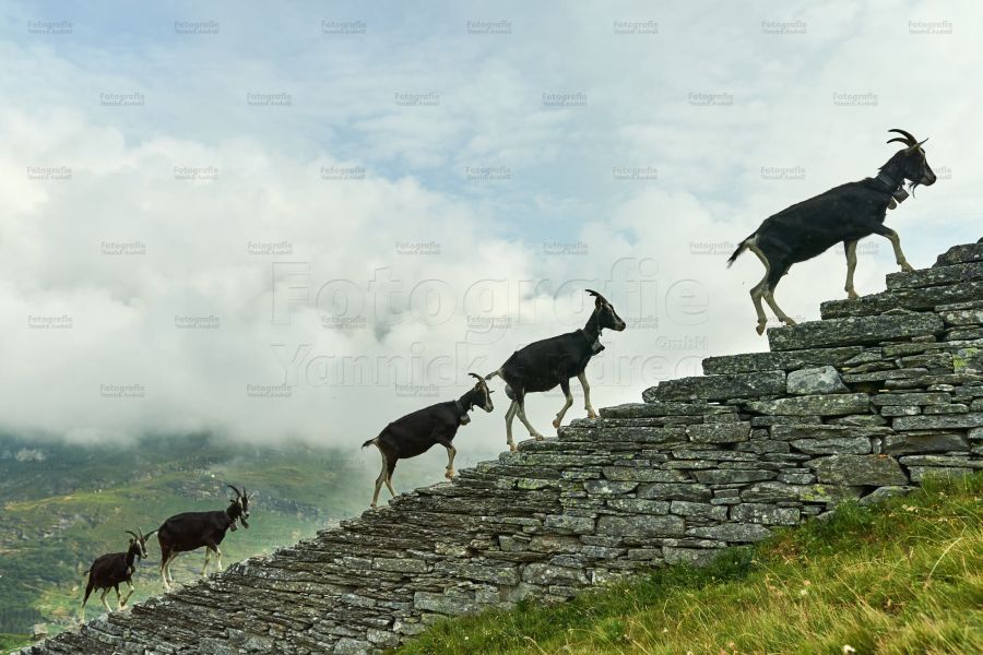 Die Alp ist nur zu Fuss zu erreichen. Für ein paar Tiere geht es ungewohnt mit der Materialseilbahn auf die Alp. Neben den Ziegen gibt es Wollschweine, Hühner, eine Katze, eine ganze Pferdeherde, Jungvieh und „es tschuppeli“ Schafe (tschuppeli = wenige Tiere). Mit der Milch der Ziegen wird erstklassiger, an Wettbewerben stets ausgezeichneter, cremiger Alpkäse hergestellt.